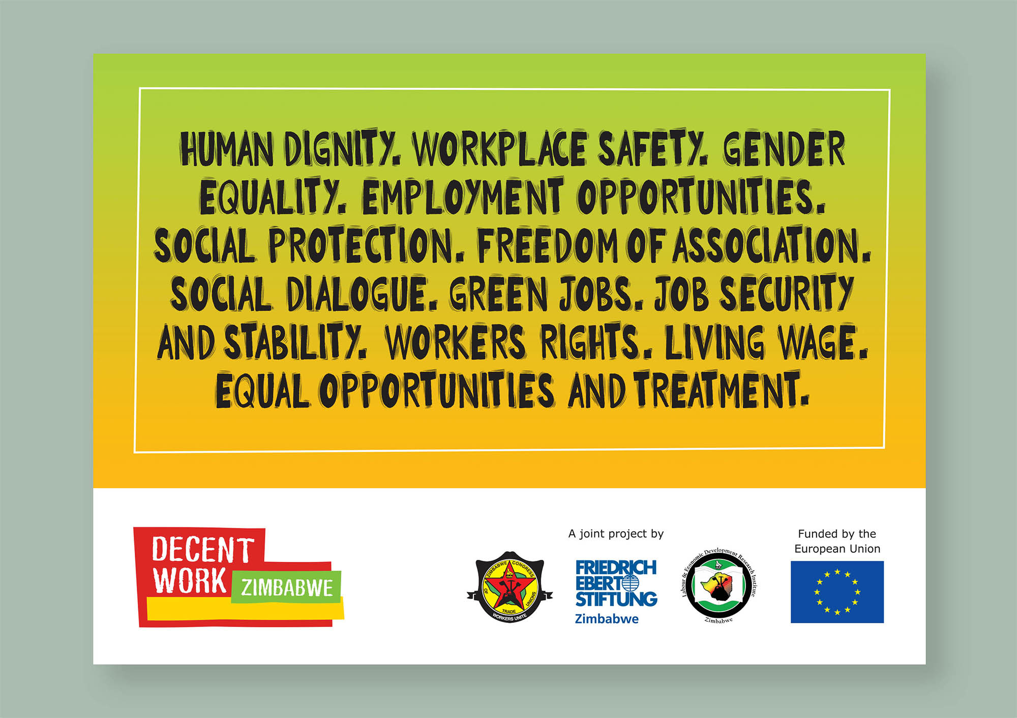 Decent Work Zimbabwe is a joint project by Zimbabwe Congress of Trade Unions (ZCTU), FES and Labour & Economic Development Research Institute (LEDRIZ). Funded by the European Union (EU).